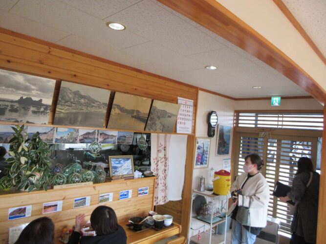 玄関を開けるとカウンター席が3席。天井に近い壁には昔の地元小泊の写真が飾られています。